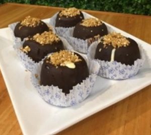 Bombones con crema de vainilla, corazón de dulce de leche, cobertura de chocolate y prali