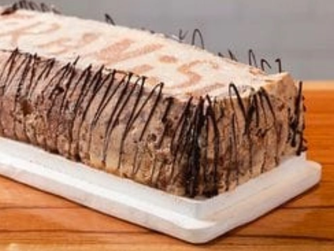 Postre helado de 3 niveles con vainilla, frutilla y chocolate. Decorado con hilos de choco