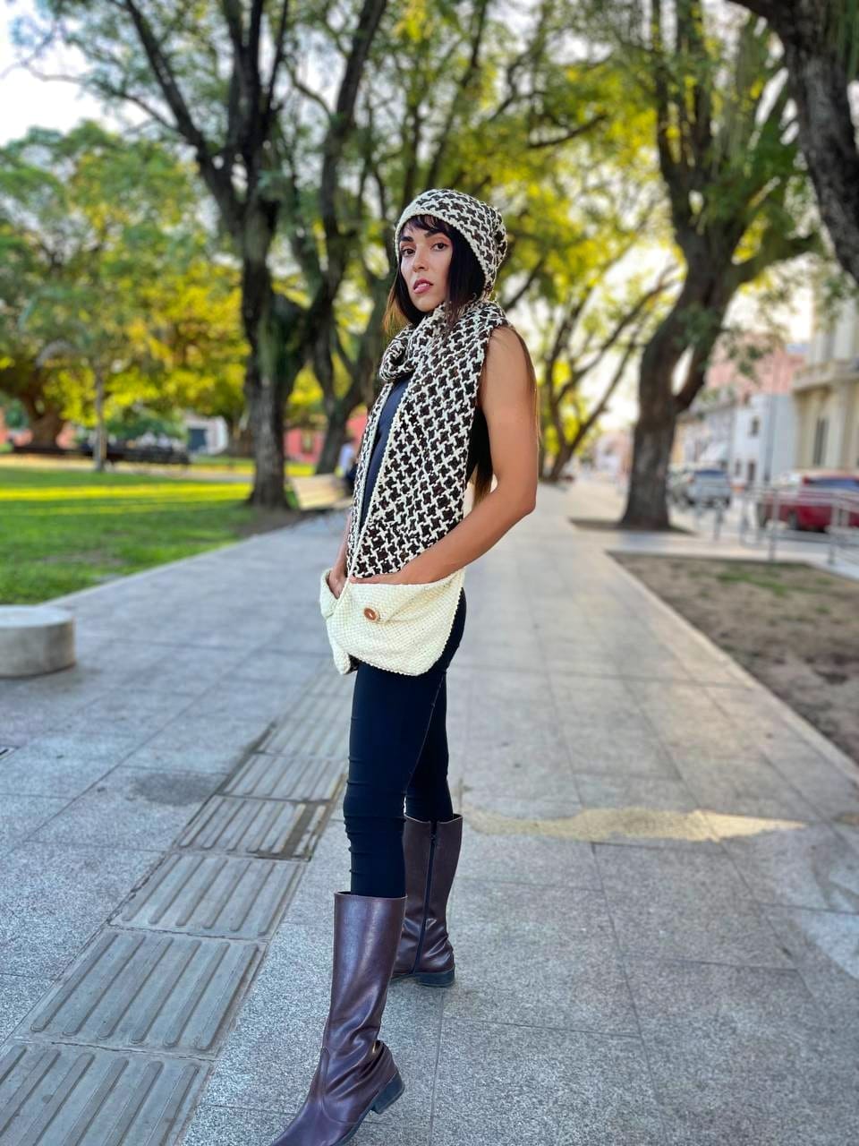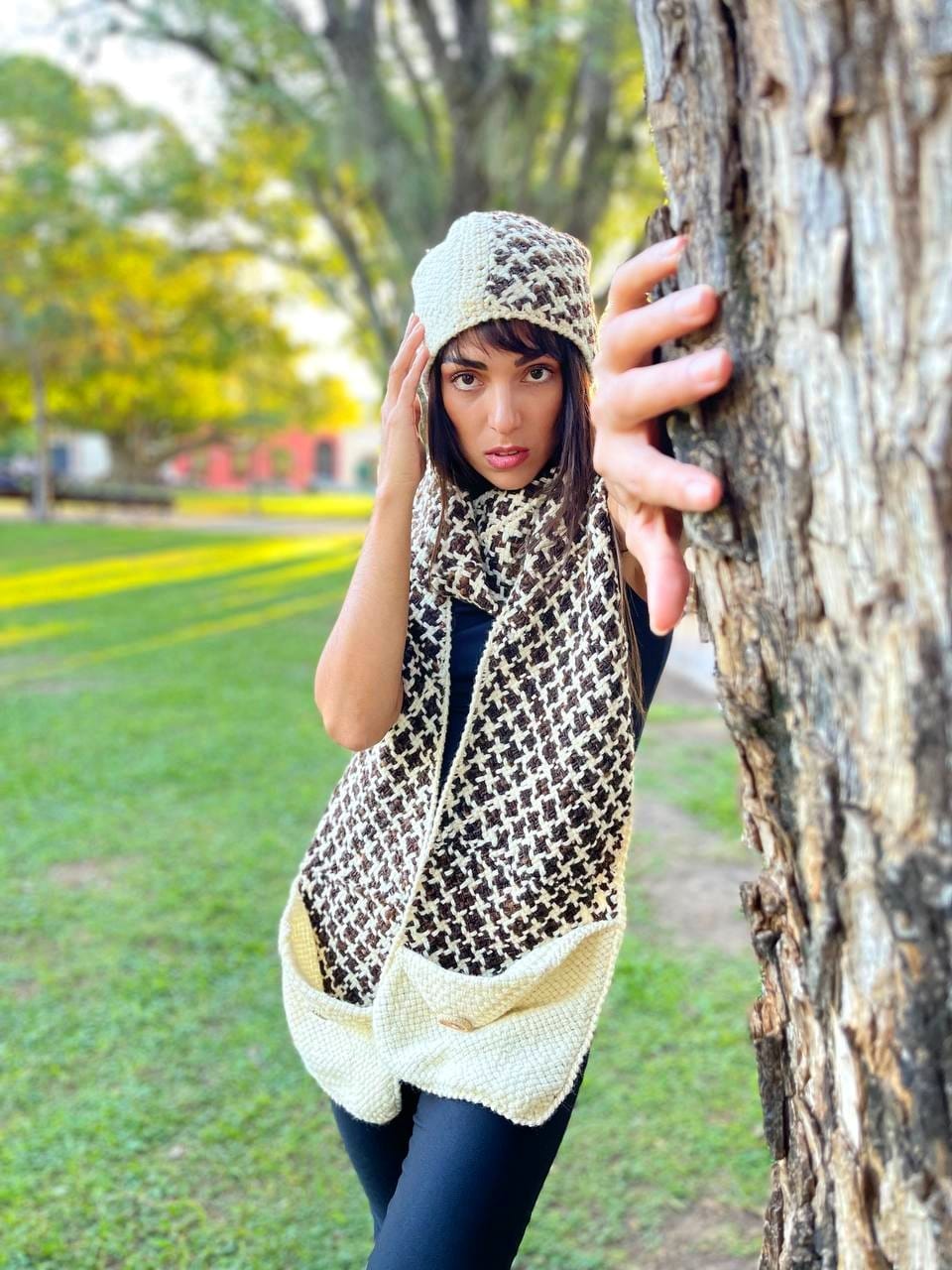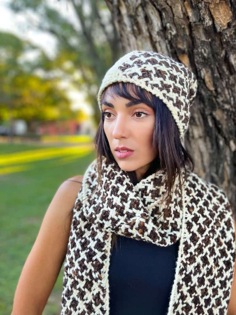 En cuero, detalle bordado, tejido en lana cruda hilada a mano en color chocolate (diseño pied de poud)