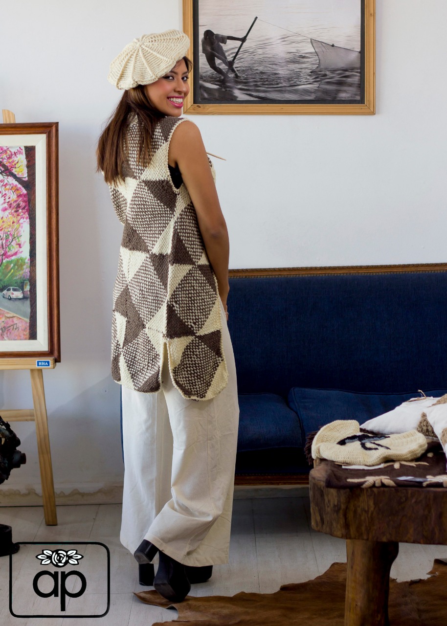 Diseñado y confeccionado en Bastidor cuadrado común de 20cmx20cm en Lana cruda color chocolate y crudo, tejido con punto fantasía, detalle de prendedor en asta de ciervo