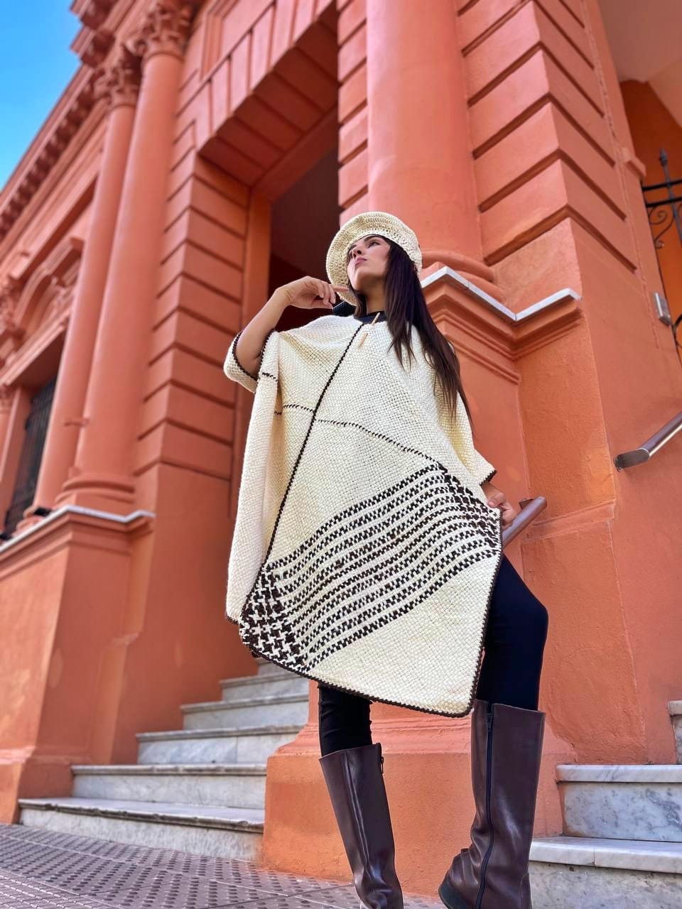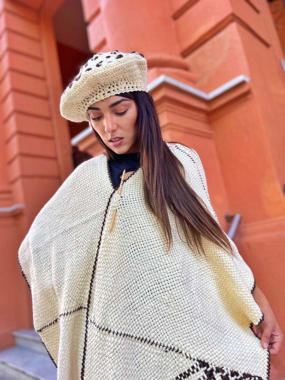 En bastido cuadrado común en lana cruda detalle en uno de los cuadrados en lana color chocolate