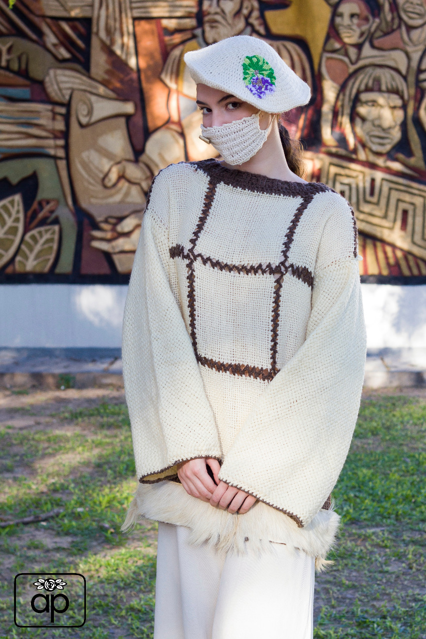 Tejido en Bastidor Colombiano de 20cmx20cm en Lana Cruda, las Mangas tejidas en Bastidor Cuadrado de 50cmx50cm, detalle de piel de chivo en la parte inferior