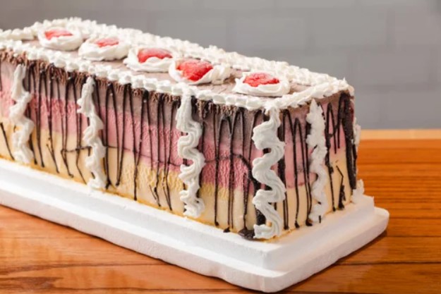 Postre helado de 3 niveles con vainilla, frutilla y chocolate. Decorado con hilos de chocolate y crema